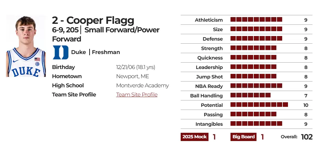 在ESPN最新一期的2025年模拟选秀中,弗拉格也是高居榜首,最被看好成为状元秀。作为一名非常全能的球员,弗拉格目前的选秀模板是马里昂和基里连科。在NBA DRAFT网站上,他的总评分数高达102分,其中潜力被打了10分的满分。